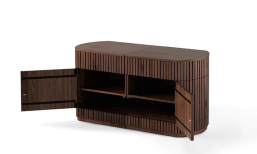 Transformer TableA modern round sideboard with a striking curved silhouette and concealed storage. Vertical sliding panels hide drawers, cabinets, and integrated co...